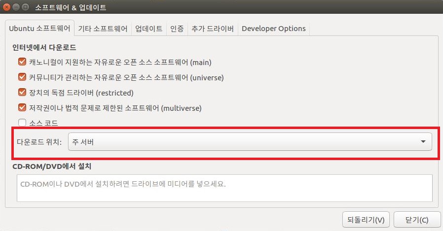 다운로드 위치: 를 주 서버로 바꾸고 나가줍니다.
